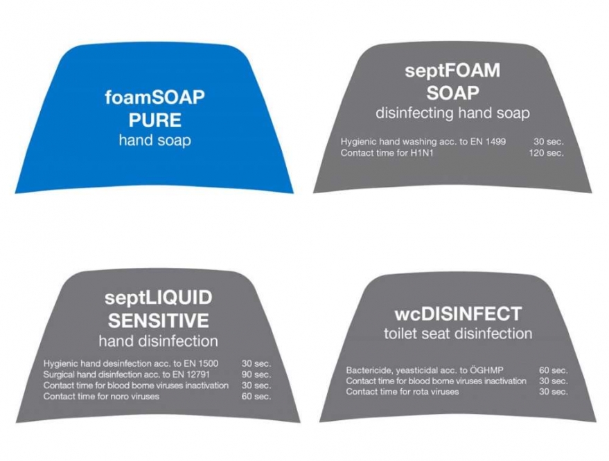 Ces étiquettes garantissent un haut niveau de sécurité d'application. Elles indiquent le domaine de la désinfection et les temps de désinfection recommandés.