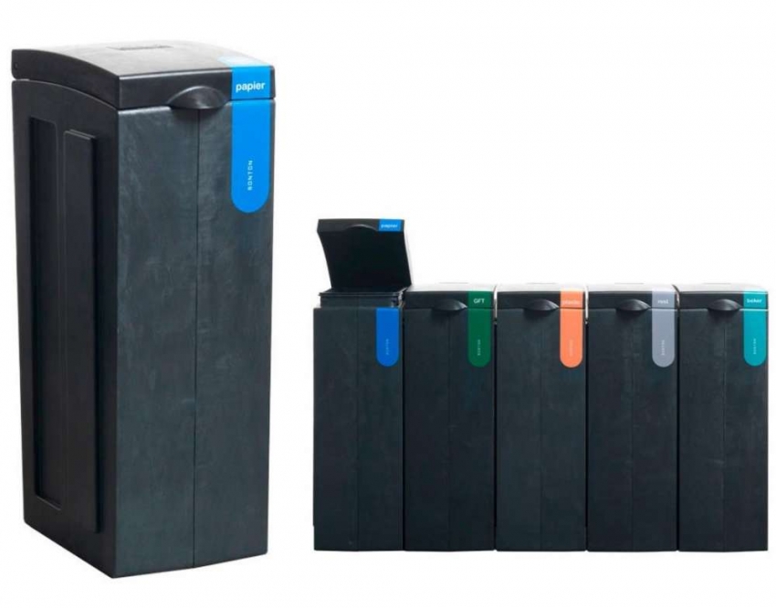Poubelle de tri fabriquée en polypropylène 100% recyclé et conçue pour un usage intensif.
