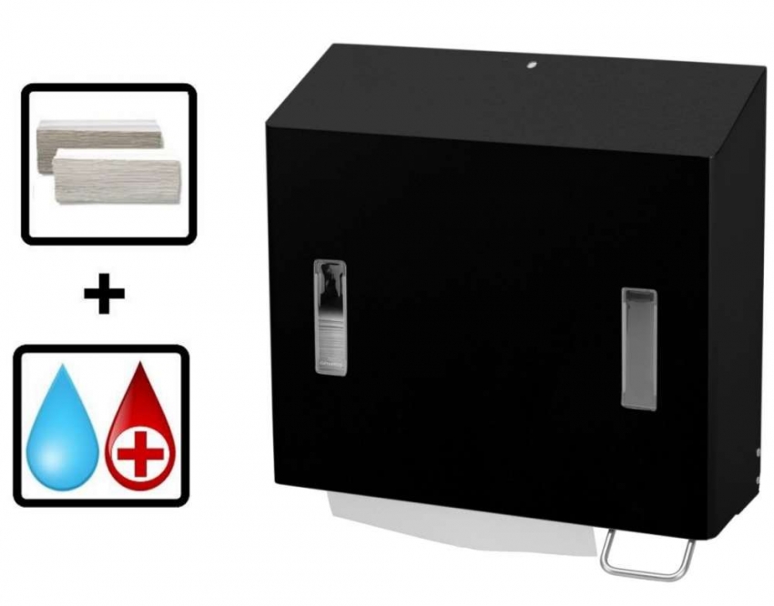 Combine le distributeur de serviettes et le distributeur de savon liquide (avec réservoir) dans un même boîtier. Idéal pour les locaux exigus.