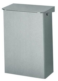 Afvalbak in aluminium voor muurbevestiging, kan eenvoudig van de muurplaat geklikt worden door middel van een drukknop langs de zijkant.