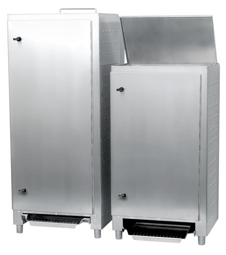 Afvalbak in geborsteld rvs met voetpedaal en deur aan de voorzijde.
