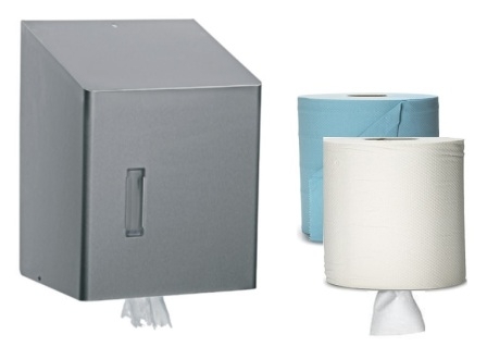 Dispenser voor papierrollen met centrale afwikkeling.