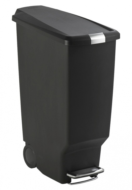 Smalle kunststof pedaalemmer met gedempt deksel en makkelijk verrijdbaar door ingeboude wielen.