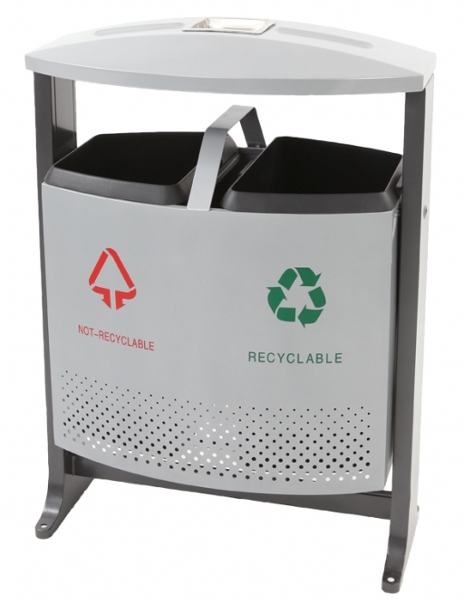 Recycling afvalbak van gepoedercoat staal met regendak, voorzien van 2 binnenbakken (2x39L).