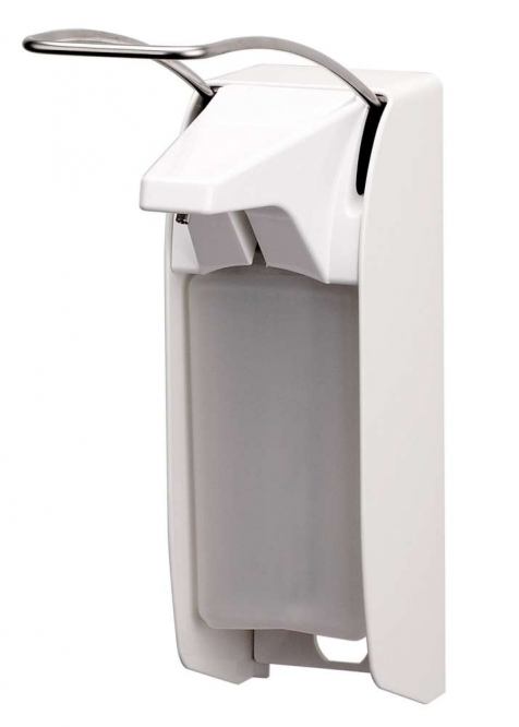 Ingo-man dispenser met witte aluminium behuizing en RVS gepolijste bedieningsbeugel.