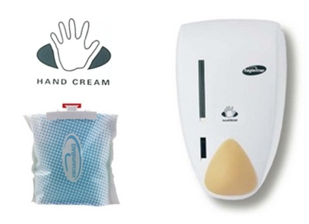 Kast in wit ABS, met een gele drukknop, en met het symbol "Hand Cream".