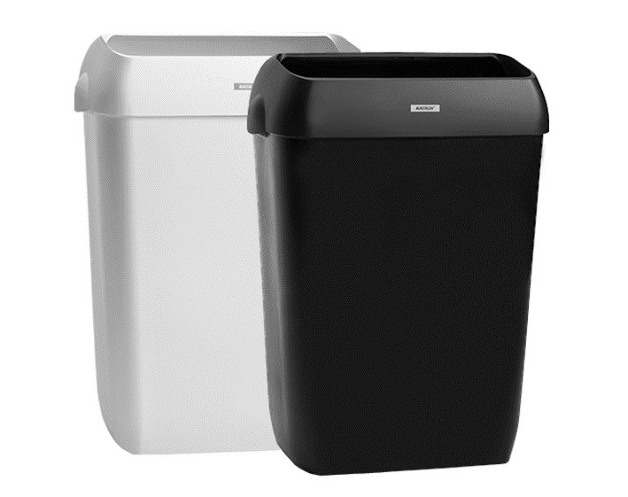 Afvalbak in wit of zwart kunststof, met een open deksel.