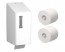 Dispenser voor 2 compacte rollen toiletpapier met doppen. De rollen schuiven in de dispenser.