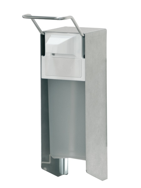 Ingo-man dispenser met roestvrij stalen behuizing en RVS gepolijste bedieningsbeugel.
