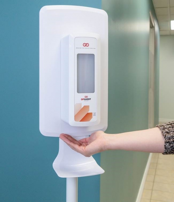 Vrijstaande desinfectiezuil met TouchFree dispenser met desinfectiegel