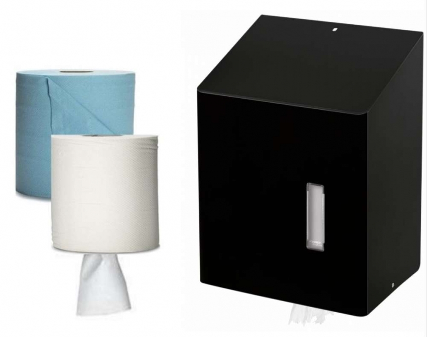 Dispenser voor papierrollen met centrale afwikkeling.