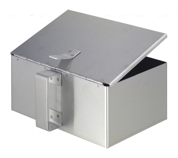 Coffret en inox, avec un couvercle sur charnière. Pourvu d'une poignée et d'un couvercle qui se referme par son propre poids.
