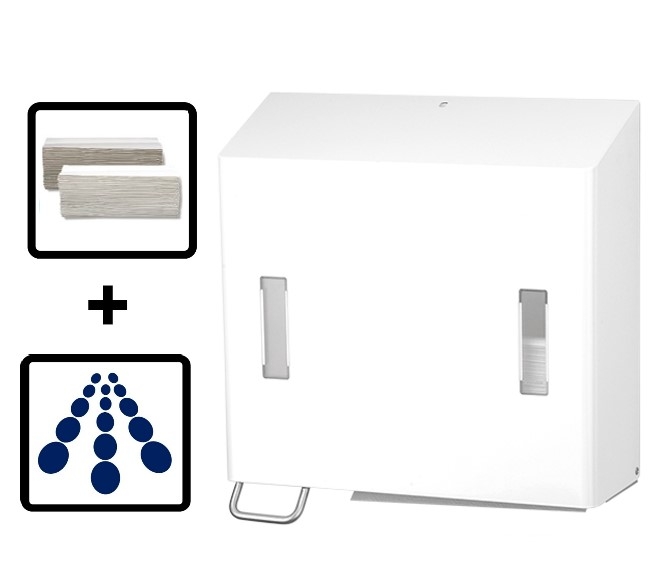 Combine le distributeur de serviettes et le distributeur de lotion à pulvériser (avec réservoir) dans un même boîtier. Idéal pour les locaux exigus.