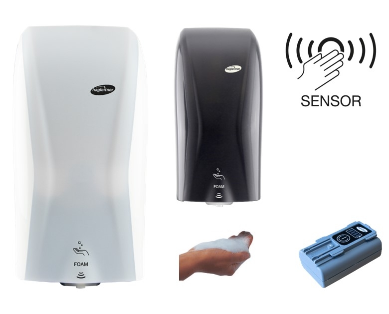 Distributeur automatique. Alimenté par 1 batterie rechargeable (non comprise). Assure une distribution du savon, sans contact des mains avec le distributeur.