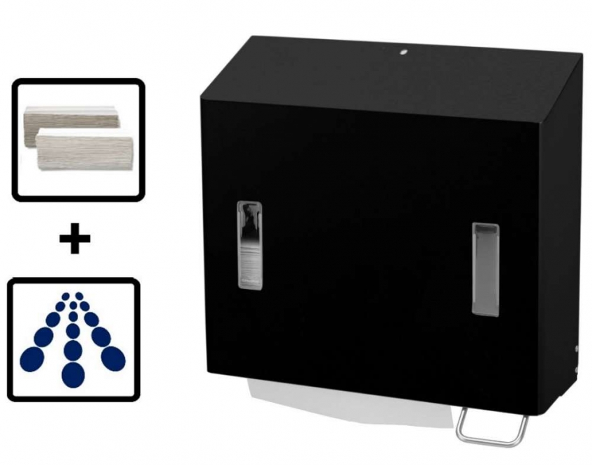Combine le distributeur de serviettes et le distributeur de lotion à pulvériser (avec réservoir) dans un même boîtier. Idéal pour les locaux exigus.