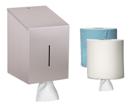 Dispenser in geborsteld rvs voor een papierrol met centrale afwikkeling