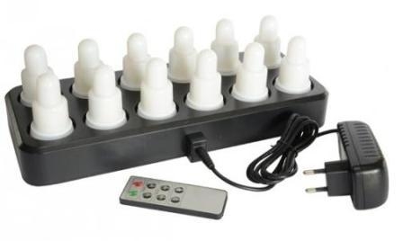 Complete set bevat 1 laadstation, 12 Warm White led-kaarsjes en 1 afstandbediening