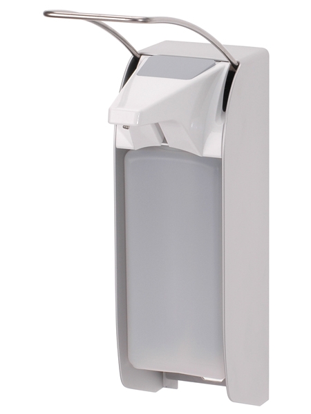 Ingo-man dispenser met roestvrij stalen behuizing en RVS gepolijste bedieningsbeugel.