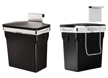 Afvalbak van kunststofi n stevige stalen construcie om eenvoudig aan de binnenkant van een keukenkasje te hangen.