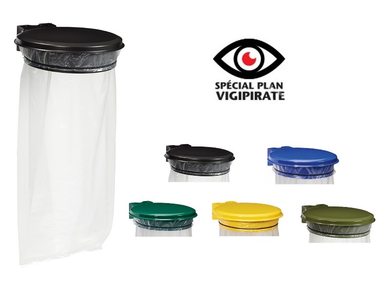 Wandmodel met deksel. Voor binnen of buiten. Verschillende kleuren. Voor 1 zak van 110L. Zak op zijn plaatst gehouden met elastische riem.