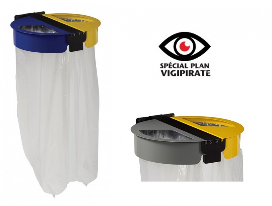 Wandmodel met 2 open deksel. Voor 2 zakken van 110L. Zak op zijn plaatst gehouden met elastische riem.
