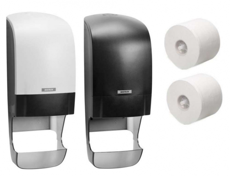 Dispenser in kunststof voor 2 rollen Katrin System van grote capaciteit. Voorzien van Core Catcher.