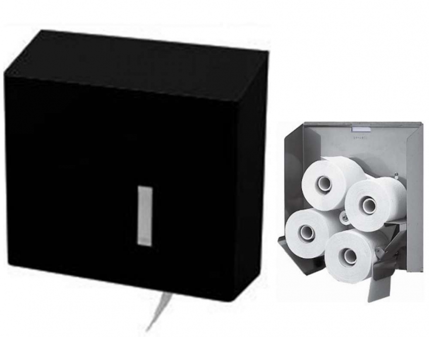 Automatische dispenser voor 4 traditionele rollen toiletpapier. De opgebruikte rol wordt automatisch vervangen door een reserverol.