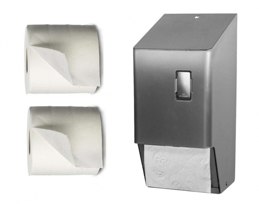 Dispenser voor 2 traditionele rollen toiletpapier.