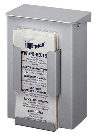 Combinatie van afvalbakje met dispenser voor papieren hygiënezakjes.